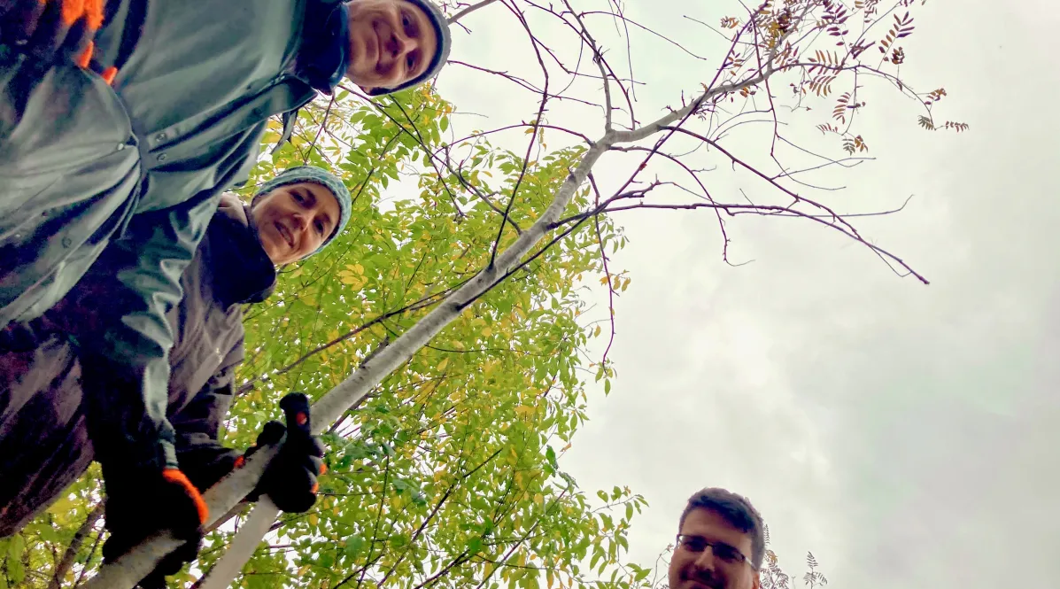 Mit einer Geschwindigkeit von einem Hektar je Arbeitstag geht es voran. Eiche, Buche, Linde, Ahorn. Buche, Linde, Ahorn, Eiche. Ein gepflanzter Laubbaum nach dem anderen - und als Rarität auch mal eine Vogelbeere aus Naturverjüngung - wird von den Freiwilligen, falls notwendig, freigeschnitten von bedrängender Spätblühender Traubenkirsche, peitschender Hängebirke oder stechender Brombeere. Wobei letztere sich in dem 10-jährigen Bestand mittlerweile von alleine verabschiedet;