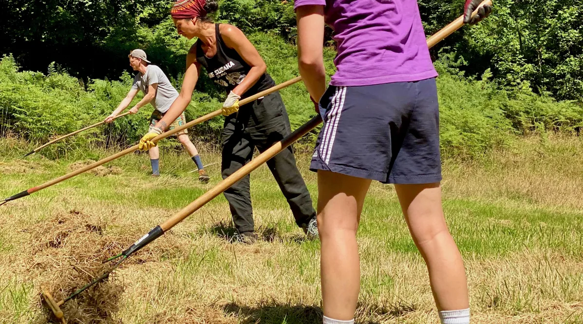 Ohne Mahd oder Nutzung wäre sie rasch etwas anderes, was es schon reichlich gibt in der Ü80-Zone [Waldanteil in der Gemeinde bei mehr al 80 Prozent]. Die Wiese ist in Teilen als Nasswiese und Magerrasen mit Niedermooranteil kartiert, am Bachverlauf kommen Torfmoose vor. Generell ein magerer Standort, daher Abtransport des Mähgutes. Vorhergehend: Rechenaufgabe, Spezialdisziplin Synchronrechen.