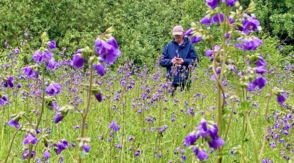 Achtklässler¡nnen der Montessorischule Kaufering mit ihren Lehrkräften im Einsatz. Inmitten eines Blütenmeers der floralen Himmelsleiter (Polemonium caeruleum). Klar erkennbar: Die gefiederten Blätter sind die Leitersprossen, auf denen eins direkt zu den himmelblauen Blüten und gen Himmel steigen kann. Was die Rote-Liste-Art hier stört: die invasive Kanadische Goldrute.