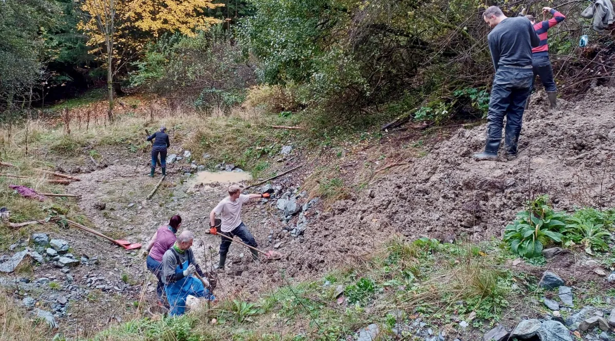 Sie sollen den Unterschied machen. Genauer: Die Freiwillligen machen damit den Unterschied. Die 350 Eimer-Masse wird runtergeschaufelt und auf den steinigen und bisher undichten Beckengrund aus Diabasschotter verteilt. Weitere Verdichtung mit Holzstampfstämmen von Hand. Es schmutzt, der Zulauf läuft weiter. Feuchte Erde zu dichter Erde. Stunden vergehen, irgendwann staut das Wasser. Die Wasserfläche ist gegen Abend groß genug für den ultimativen Test. Beim Steine flippen muss der Stein mindestens zweimal auf der Wasseroberfläche aufditschen, bevor das andere Ufer erreicht ist. Anhaltender Beifall von herbeifliegenden Libellen.