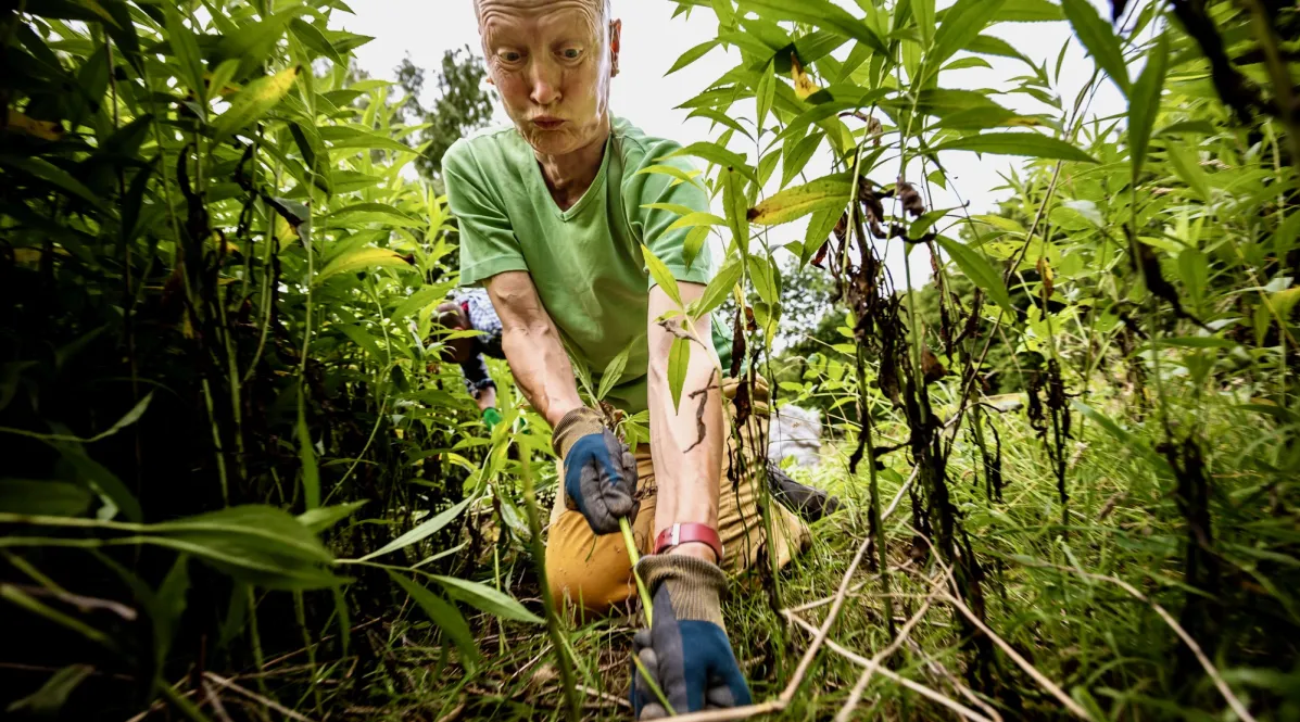 In der Liste der invasiven Arten, Abteilung Gefäßpflanzen, findet sich unter "S": Solidago canadensis (Kanadische Goldrute), Status: etabliert. Zu finden ist sie überall und daher auch direkt vor dem „Urwald vor den Toren der Stadt", bestandsbildend auf einer Wiese vor dem Camp der Freiwilligen.