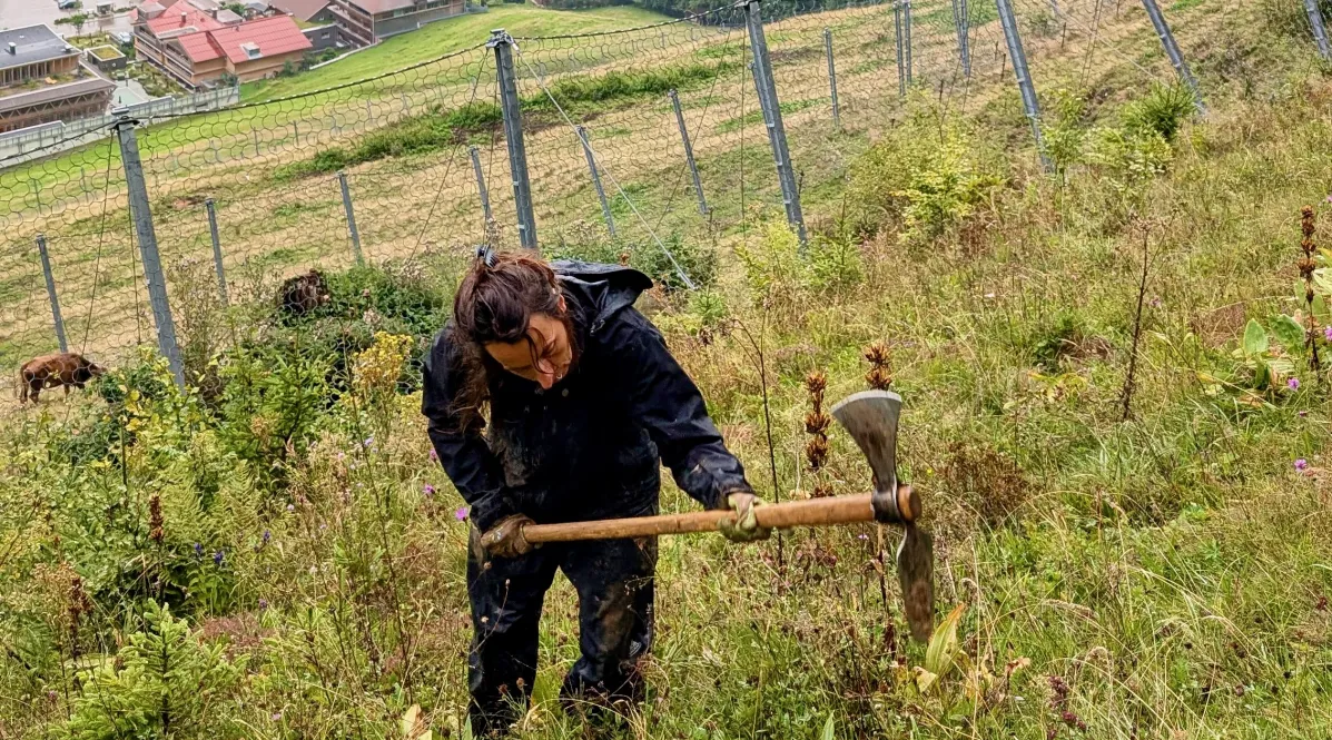 Pflanzung auf der Kuhweide, zwischen Schneenetzrechen. Direkt unter den Freiwilligen liegt der Ort, der es im Januar 2019 in die Nachrichten brachte. Um fünf in der Früh krachte damals eine Lawine in ein Viersternehotel und verwüstete es. Danach war das Wort Schutzwald populär. Viel Geld für viel technische Verbauungen wurde seither in den Hang über Balderschwang gesteckt, um vor Lawinen zu schützen.