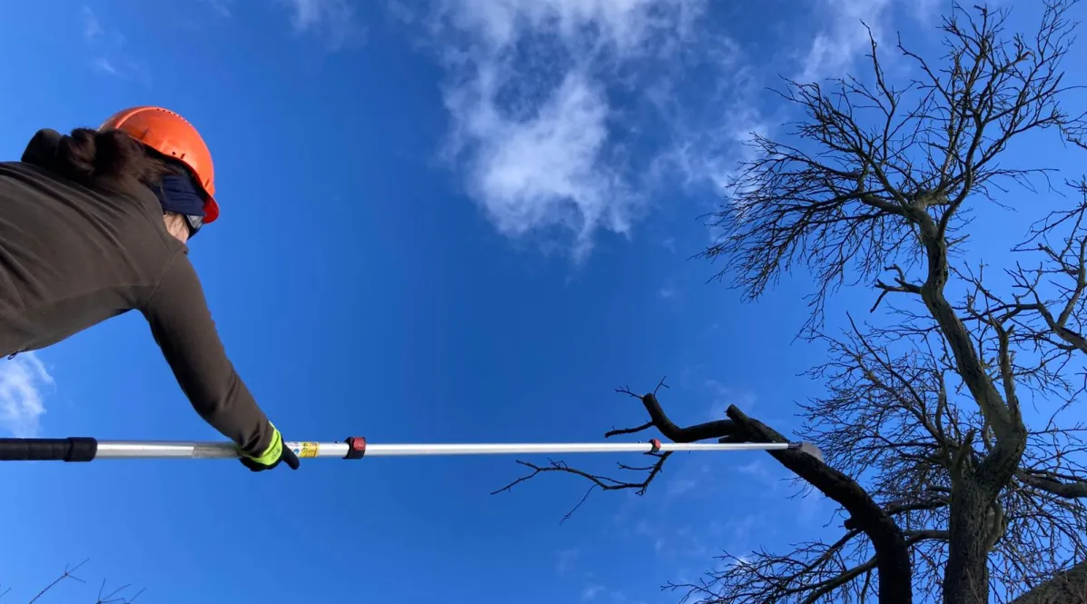 Jetzt kommen unsere Freiwilligen: Vergreiste Bäume auf der Streuobstwiese sollen mit einem Pflegeschnitt verjüngt und stabilisiert werden und länger leben. Die Früchte interessieren hier weniger, die vielfältigen Sorten sollen erhalten bleiben. Bei schon abgestorbenen Bäumen wird ein Torso-Schnitt vorgenommen, die ausladenden Äste werden abgenommen und der Baum bleibt als Totholz-Biotop stehen.