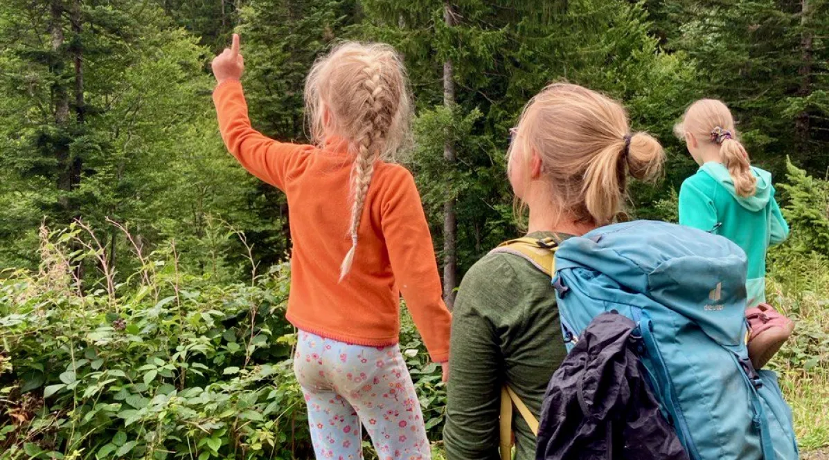 „Schau, das sind hier alles Tannen. Oder Fichten. Die sind faul und lassen ihre Zweige immer runterhängen." Auf der gemeinsamen Abschlussexkursion lernen alle noch was dazu. Die Acht- bis Zwölfjährigen sind munter am referieren. Schließlich haben sie während der Woche einiges erlebt ohne ihre Eltern. Sie waren auf einer nahegelegenen Käsealm beim Käsemachen.
