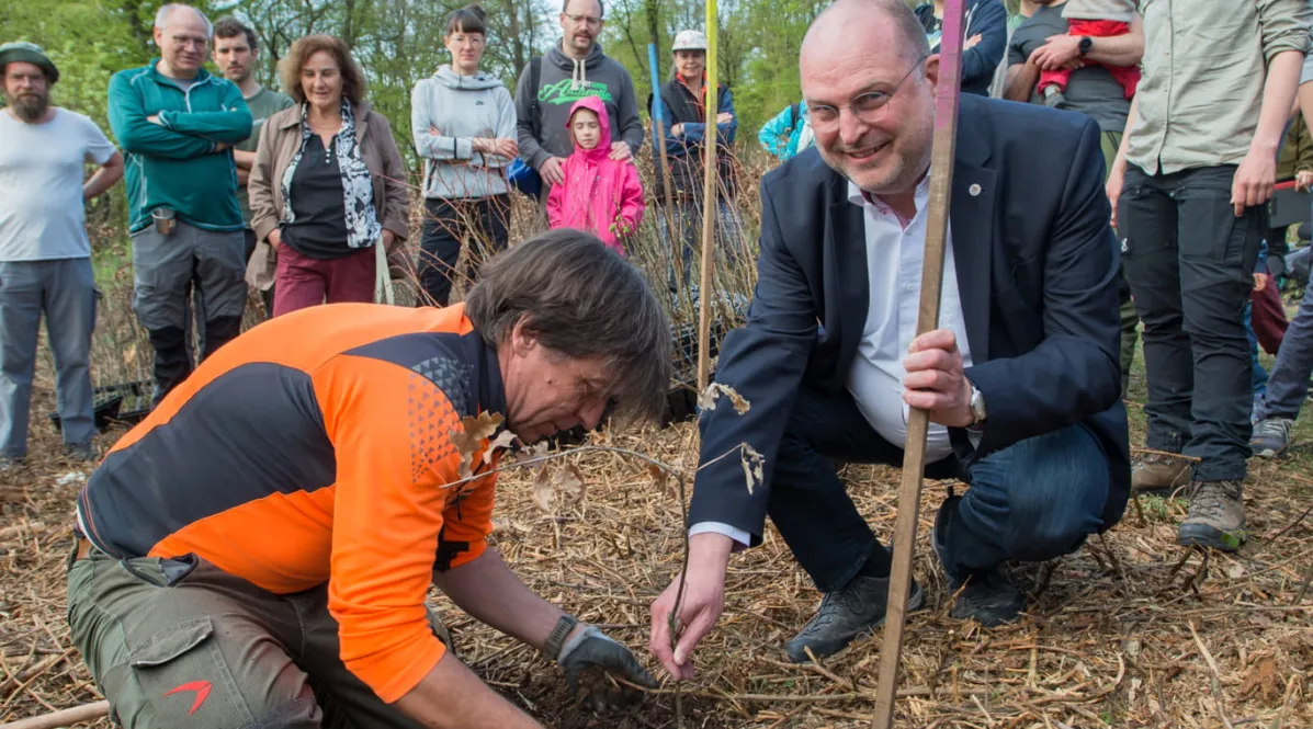 Die Freiwilligen pflanzten in steinigem Boden 1.800 Traubeneichen, Winterlinden, Elsbeeren und Lärchen auf durch Sturm, Trockenheit und Borkenkäfer geschädigten Waldflächen. Zusammen mit der bereits vorhandenen Naturverjüngung aus Ahorn, Kirschen, Vogelbeeren und Buchen wird so ein humus- und artenreicher Mischwald wiederhergestellt.