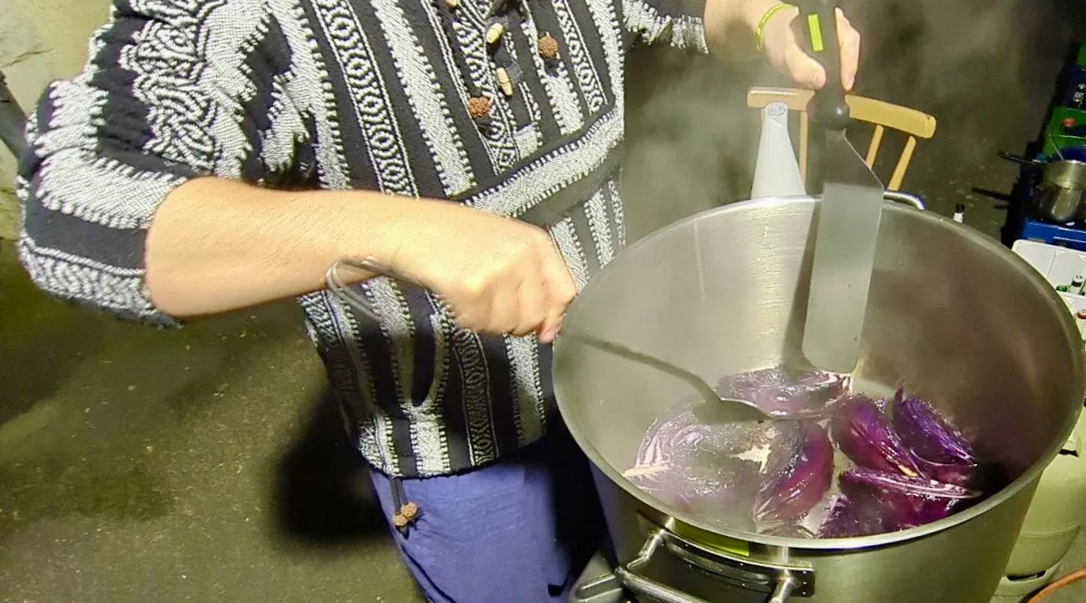 Ah - ja. So macht er das also. Im großen Topf auf dem Gashockerkocher und unter den neugierigen Augen der anderen Kochmenschen des Bergwaldprojekts. Miso-Schmorblaukraut, also Rotkohl-Spalten, die mit Misopaste geschmort werden. Dazu wird Kartoffelpüree serviert. Eine Mahlzeit, die auch dieses Jahr wieder von Freiwilligen in den Projektwochen gegessen werden könnte. Heute gemeinsam gekocht von 17 Projektkochenden des Bergwaldprojekts auf ihrem allerersten Küchenleitungstreffen. Endlich mal ausreichend Zeit für unsere Kochavantgarde vor dem Saisonstart. Kein Rezepttauschtreffen, sondern ein Wochenende lang Kennerlernen und Kulinarika sowie