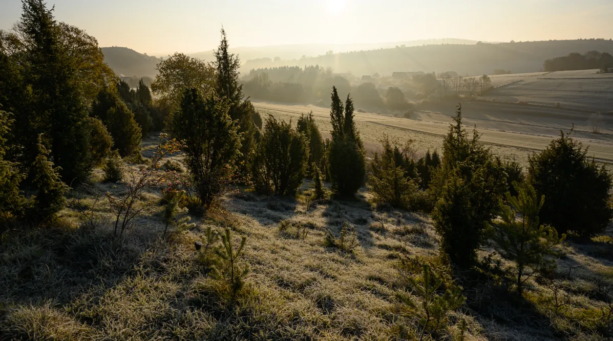 Grenzlandschaften mit Wacholderheiden und Blütenwiesen: Das Projektgebiet liegt zwischen Bonn und Aachen und ist gekennzeichnet durch eine abwechslungsreiche Landschaft mit Waldinseln, Bächen, Hügeln und Wacholderheiden. Die Eifel ist ein weitgehend bewaldetes Mittelgebirge, in der die Rotbuche jedoch größtenteils durch die Fichte ersetzt wurde. Besonders in den kalkreichen Gebieten ist aber auch Kulturland stark vertreten, in den niederschlagsreichen Hochlagen Grünlandwirtschaft, in den Tieflagen und der Voreifel Ackerbau. Kleinflächig und mosaikhaft kommen auch noch Heiden und Kalkmagerrasen vor.