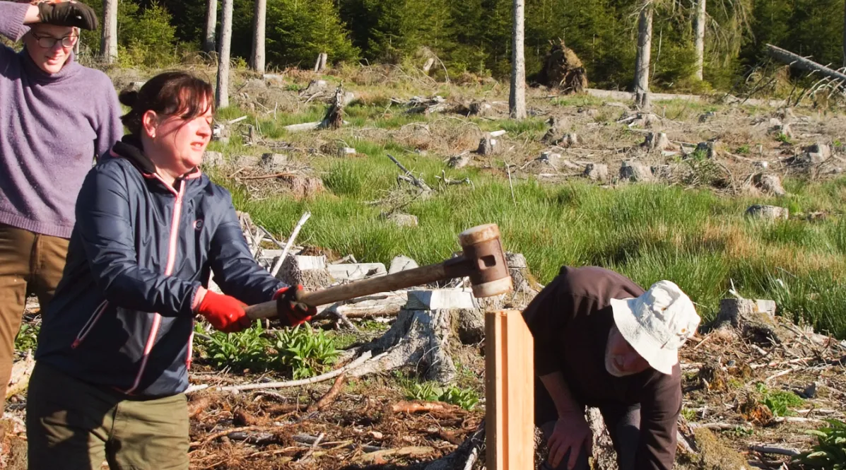 Moorwiedervernässung und Wasserrückhalt: Durch die Wiedervernässung der seinerzeit zu forstwirtschaftlichen Zwecken entwässerten Moore wird langfristig die Renaturierung eingeleitet. So können die Moore ihre Aufgaben als Kohlenstoffspeicher sowie als Lebensraum vieler seltener Tier- und Pflanzenarten wieder erfüllen. Mehr noch, durch ihre ausgleichende Funktion im Wasserhaushalt der Landschaften sind sie Daseinsvorsorge auch für uns Menschen und für den umliegenden Wald, von dem sie auch abhängen. Also ran an die Spunde: Sperren bauen, Gräben verfüllen und Binsen pflanzen! Der zweite Schwerpunkt liegt im Wasserrückhalt. Der Waldboden kann ebenfalls Starkregenereignisse abpuffern und trägt zur Grundwasserneubildung bei. Aber auch das funktioniert nur unter einem vitalen Mischwald und nach dem Rück- beziehungsweise Verbau von Menschenhand geschaffener Entwässerungsgräben.